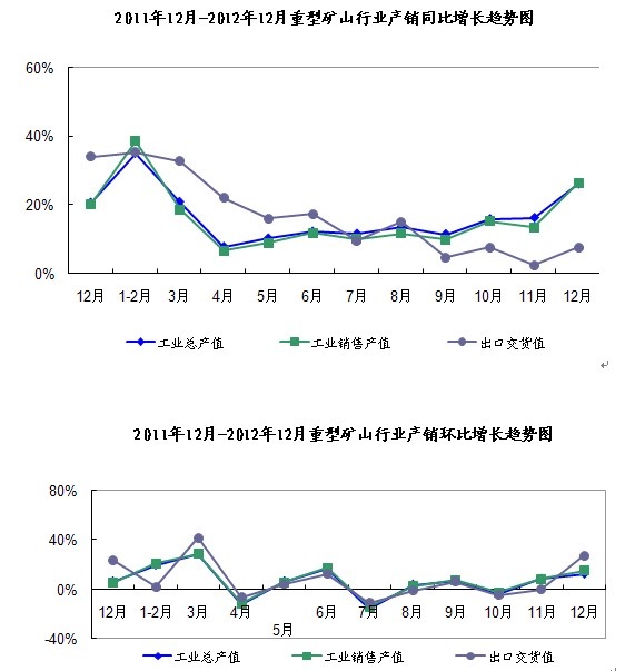 2012年1-12月份,全國(guó)重型礦山機(jī)械行業(yè)的發(fā)展形勢(shì)有所回升,工業(yè)總產(chǎn)值和銷(xiāo)售產(chǎn)值同比增速明顯上升,環(huán)比增速平緩,出口交貨值同、環(huán)比增速均有所回升。