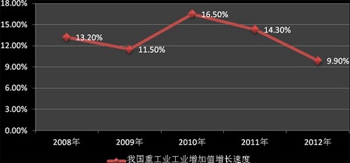 重工業(yè)主要為我國(guó)工業(yè)化生產(chǎn)提供生產(chǎn)資料,是我國(guó)經(jīng)濟(jì)增長(zhǎng)的重要參考基礎(chǔ),是推動(dòng)宏觀經(jīng)濟(jì)增長(zhǎng)的主要?jiǎng)恿Α谋恚ㄒ唬┛煽闯?,受到歐債危機(jī)、全球通脹等世界經(jīng)濟(jì)因素影響,我國(guó)重工業(yè)增長(zhǎng)動(dòng)力持續(xù)減弱。2012年,我國(guó)重工業(yè)工業(yè)增加值增長(zhǎng)速度首次回落于10%以下至9.90%,低于我國(guó)整體工業(yè)增加值增長(zhǎng)率0.1個(gè)百分點(diǎn)。